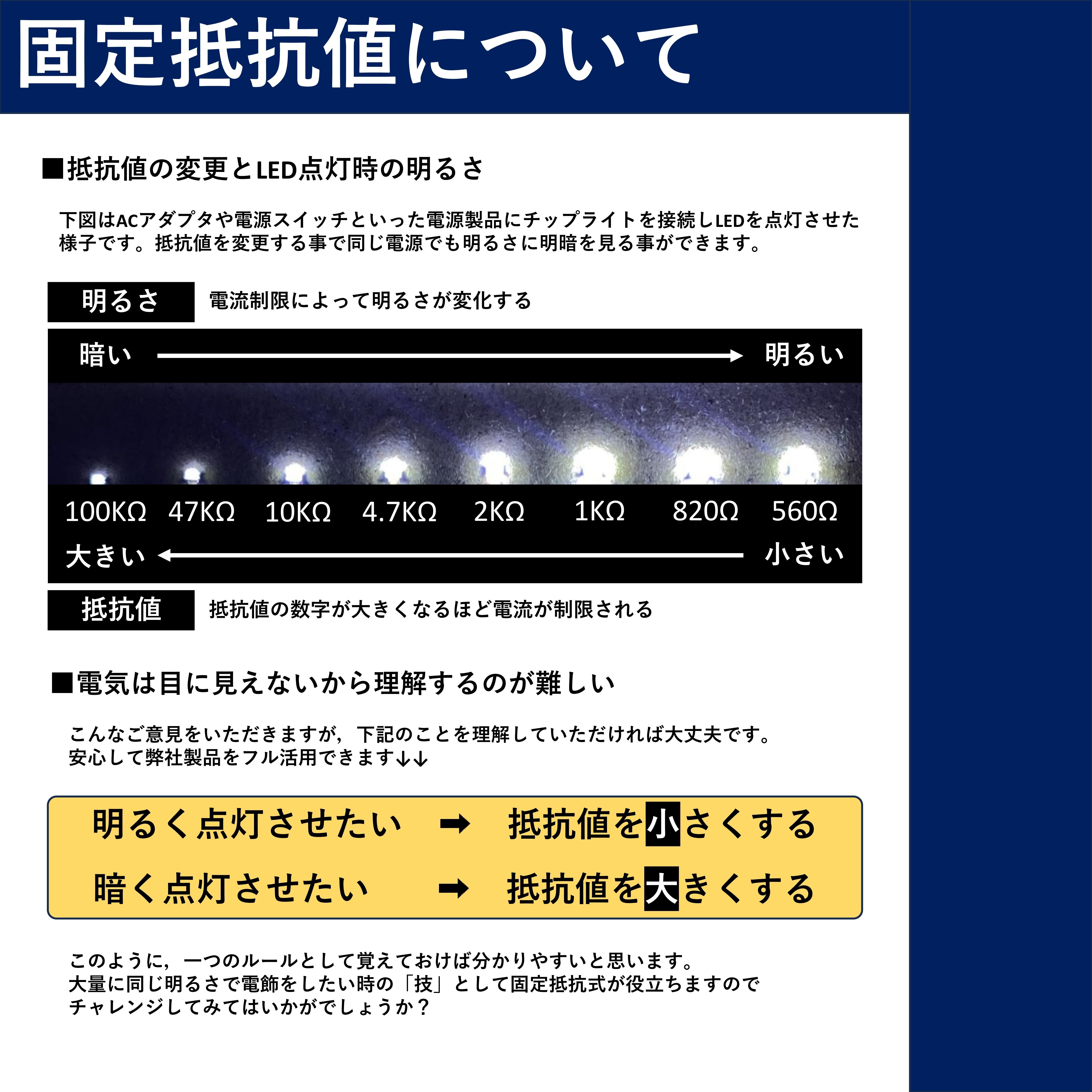 ・固定抵抗値によって明るさの強弱を変化させる事ができます。(画像参照)